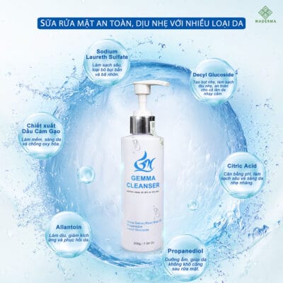 Gemma chúng tôi đã và đang mang đến thị trường Việt Nam sản phẩm sữa rửa mặt Gemma “Gemma Cleanser ” Với các thành phần là :